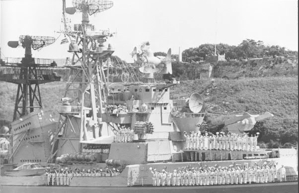Мне хорошо запомнилось, как на проводы черноморских кораблей в дальний поход прибыл Главнокомандующий ВМФ СССР Адмирал Флота Советского Союза С.Г.Горшков. На кораблях уже заканчивалось приготовление к бою и походу, а часть не стоящих на вахте у действующих механизмов экипажей всех трех черноморских кораблей была построена на Минной стенке. Мы были первыми, кто примерил на себя вновь введенную тропическую форму одежды голубого цвета, которую впоследствии носили многие тысячи советских военных моряков на кораблях боевой службы в тропических широтах. Главком ВМФ поздоровался с нами, и, называя нас богатырями, произнес напутственные слова с пожеланием счастливого плавания и уверенности, что с ответственной правительственной задачей мы справимся, и достойно пронесем Флаг Советского Военно-Морского флота.