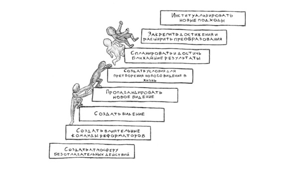 Любые большие изменения требуют нескольких последовательных шагов. Что бы вы не хотели внедрить – новую систему мотивации и показателей эффективности сотрудников, CRM для отдела продаж, выпуск на рынок нового продукта – все это займет не один день и потребует вовлечения большого количества людей. Итак, Коттер полагает, что стоит сделать следующее: