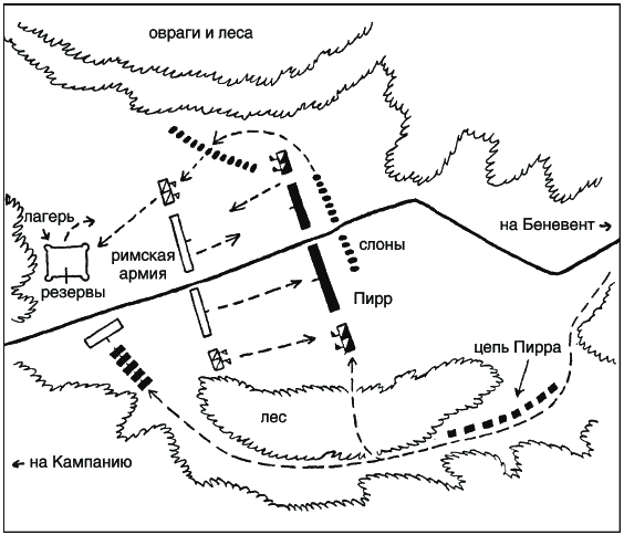 До той поры ни один римлянин не видел и не слышал о громадных чудовищах; лошади, как обычно, не вынесли их вида. Римская конница обратилась в бегство и смяла боевые порядки легионов, а Пирр напал во главе фессалийской конницы на пришедших в замешательство врагов, и битва была выиграна.