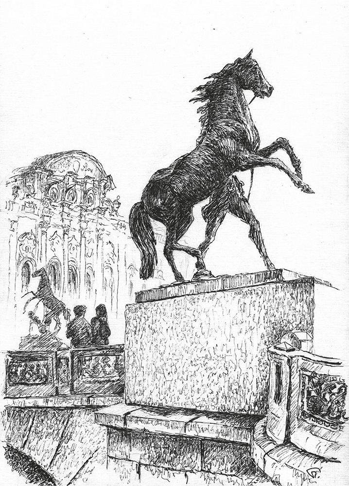 Я стою, вжавшись в чугунные перила моста. По лицу моему и платью стекает вполне натуральная грязь. Нет, мне уже не хотелось быть призраком. Моя живая человеческая плоть трепетала, испытывала унижение и боль. Я ощущал холод и пустоту всем своим существом. Словно не Акакия Акакиевича, а меня только что вытряхнули из шинели в уличную грязь. Там, где-то внизу, плескалась невидимая темная вода. А надо мною, в тумане, как над пропастью, снова летели кони; буграми вздувались их мышцы и рвались с кровью из рук поводья. Господи, какая же это была дикая и неуправляемая сила, как жалок и слаб перед ней маленький человек!