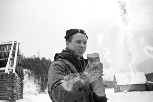 На следующий день, 28 января, из 2-го Северного тоже вышли не сразу. Юрий Юдин принял решение возвращаться домой – совсем разболелась нога. Его вещи ребята распределили по своим рюкзакам, изрядно их утяжелив. Во втором Северном внимание ребят привлёк склад геологических образцов. Судя по всему, это кернохранилище представляло собой простой навес, который находился в пределах посёлка. Один или два куска от кернов с пиритом и прожилками кварца Юрий взял с собой для пополнения геологической коллекции УПИ. Наконец, ребята тепло попрощались с Юрием и уже вдевятером двинулись дальше по маршруту похода. Уходя из 2-го Северного, кто-то из ребят сделал прощальный снимок посёлка. В кадре лишь заброшенные дома, некоторые уже без крыш, да мрачный, поросший тайгой, склон.