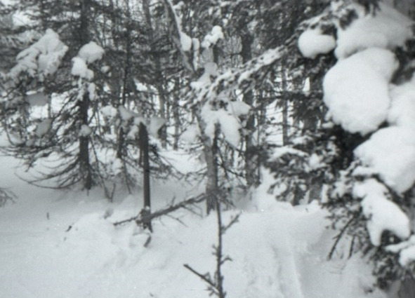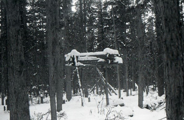 Во-первых, по тропе недавно прошёл мансийский охотник, и ребята часть пути двигались по его лыжне, пока она не ушла в сторону. То тут, то там на деревьях попадались мансийские засечки. Некоторые из них ребята сфотографировали и зарисовали в дневники. В одном месте им попался мансийский лабаз – настил на высоких столбах, или «избушка на курьих ножках», как его прозвали дятловеды.
