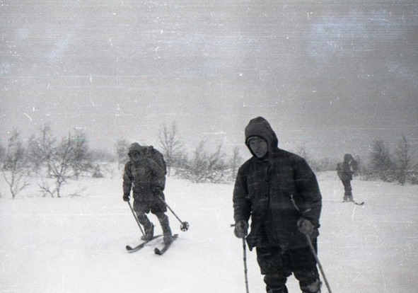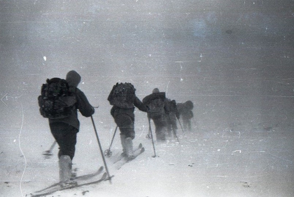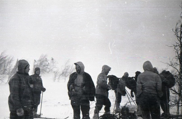 Среди фотографий дятловцев есть снимок, соответствующий этому моменту. На нём запечатлены лыжники, остановившиеся при выходе из мелколесья, сильный ветер бьёт в лицо, позёмка, видимость слабая. Отличная фотография, которая явственно передаёт всё то напряжение, с которым ребятам приходилось преодолевать трудности похода. Эту фотографию я ставлю на второе место после той, где ребята расселись на крестообразных приспособлениях для сушки рыбы. Она мне так понравилась, что я поместил её на обложку своей книги