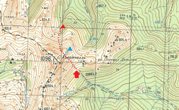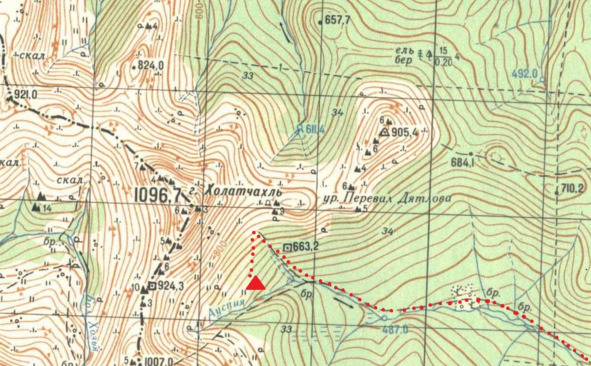 Вот три маршрута, которыми можно пройти с перевала к Отортену. По какому из них планировали идти ребята? Я думаю, что они не стали ничего выдумывать, и собирались идти к Отортену по основному зимнему маршруту, т. е. границей леса. Тем не менее, один вопрос всё равно остаётся. А именно: как группа хотела пройти северо-восточный отрог Холатчахля? Как видно из карты, его можно обойти низом (более длинный путь), а можно и перевалить через него. Я думаю, что ребята с самого начала выбрали второй, более короткий путь. На это, в частности, указывает место установки ими 1 февраля палатки, которую через месяц обнаружили поисковики. Недалеко от вершины северо-восточный отрог Холатчахля имеет седловинку – вот в этом месте ребята и хотели через него перевалить. Ввиду позднего выхода со стоянки на Ауспии переход 1 февраля однозначно планировался коротким. Времени хватало только на то, чтобы подняться на перевал, пройти северо-восточный отрог, по его западному склону спуститься в зону леса в долине Лозьвы и здесь встать на ночёвку. Но не получилось.