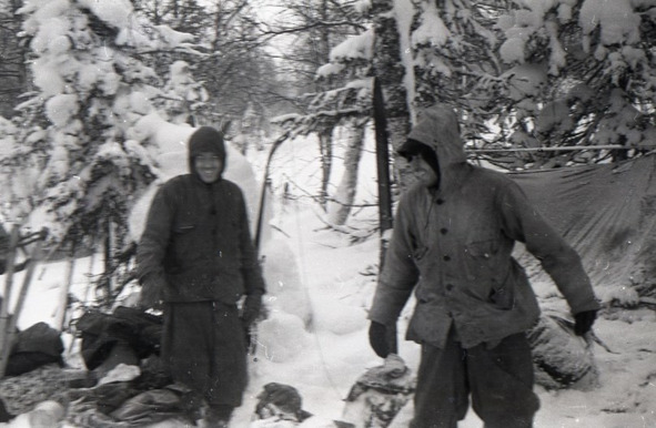 Есть фотография, на которой ребята уже спустились немного вниз, в зону леса, и как будто что-то обсуждают. Что они могли обсуждать? В общем, вариантов дальнейших действий могло быть два. Первый. Спуститься вниз к Ауспии в зону леса по своей же лыжне, т.е. в юго-восточном направлении, заночевать и там же на следующее утро устроить лабаз. Плюс этого плана заключался в удобстве (двигаться пришлось бы по уже проложенной лыжне). Но минус был в том, что в этом случае лабаз находился бы слишком далеко от главного Уральского хребта, а значит, на обратном пути с Отортена пришлось бы делать большой крюк, чтобы забрать вещи. Второй вариант. Вернуться к Ауспии не по своей лыжне в юго-восточном направлении, а спуститься к ней в южном направлении, практически к её истоку. Тогда бы лабаз располагался намного ближе к хребту. Однако в этом случае до ночёвки пришлось бы идти ещё один-два километра по целине в глубоком снегу. Вот эти плюсы и минусы, возможно, ребята и обсуждали на том снимке (хотя я на этом не настаиваю, может, ребята просто отдыхают), и в конце концов выбрали второй вариант.