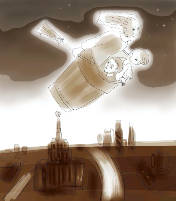 Ребята осторожно залезли в ступу. Яга с метлой в руках лихо взлетела и плюхнулась между мальчиками.