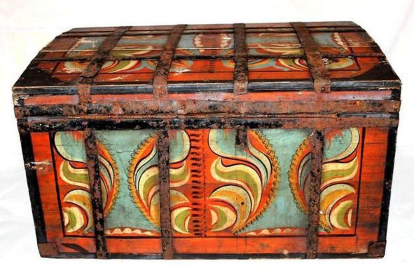 Мастера изготавливали сундуки двух типов (из хвойных пород дерева): с окраской и росписью, оковкой «мороженой» жестью или полосами железа. В конструктивном отношении это простые вещи – ни ножек, ни каких-либо внутренних отделений они не имели (надо отметить, что у вятских сундуков всегда только одна петля, либо использовалось замочное отверстие).