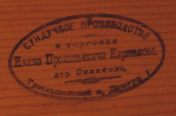 Клеймо заведения И. П. Каржакова значительно отличалось от клейма Алексеева. Оно имело овальную форму, в нем было написано: «Сундучное производство и торговля Ивана Прокопьевича Каржакова дер. Синицына, Троельжанская вол. Кунгурский у.». В клейме четко указаны имя, отчество и фамилия владельца, точный адрес сундучного заведения.