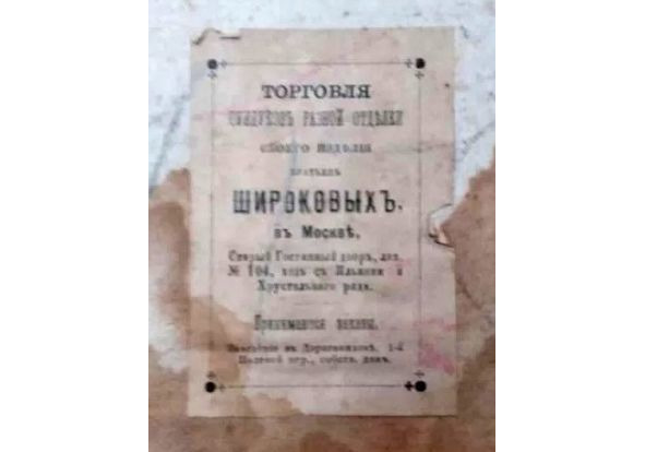 Рекламная этикетка сундучной лавки братьев Широковых. Текст: «Торговля сундуков разной отделки своего (?) изделия братьев Широковых в Москве. Старый Гостиный Двор, лав. №164, вход с Ильинки и Хрустального ряда».