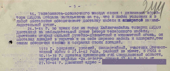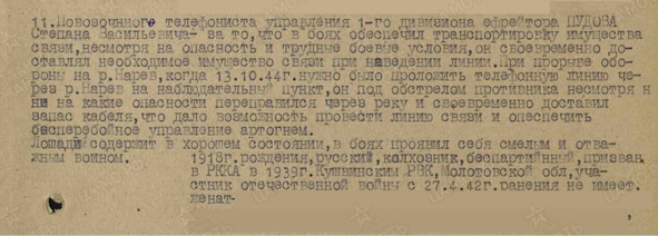 Ефрейтор 27 артиллерийского полка 5 стрелковой Орловской Краснознамённой орденов Суворова и Кутузова дивизии (2 Белорусский фронт) С. В. Пудов был награждён 27 октября 1944 года медалью «За отвагу». Приказ гласил: «Наградить медалью „За отвагу“ повозочного телефониста управления 1 дивизиона ефрейтора Пудова Степана Васильевича – за то, что в боях обеспечил транспортировку имущества связи, несмотря на опасность и трудные боевые условия, он своевременно доставлял необходимое имущество связи при наведении линии. При прорыве обороны на реке Нарев, когда 13.10.44 г. нужно было проложить телефонную линию через реку Нарев на наблюдательный пункт, он под обстрелом противника несмотря ни на какие опасности переправился через реку и своевременно доставил запас кабеля, что дало возможность провести линию связи и обеспечить бесперебойное управление артогнём». И добавление снизу: «Лошадей содержит в хорошем состоянии, проявил себя смелым и отважным воином»31. Там же указано, что Степан Васильевич по социальному статусу – колхозник, беспартийный, женат.