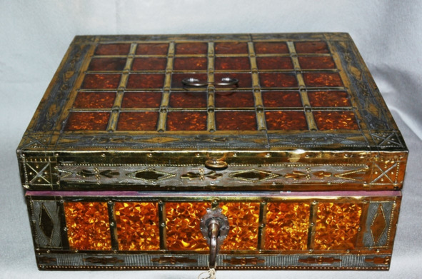 Ил. 9. Погребец. Мастерская О. П. Лаптева. До 1902 года, Нижний Тагил. Дерево, жесть, латунь, «мороз» по жести, гравировка, литье (один из экспонатов выставки, ныне – в ОНИ ГРМ).