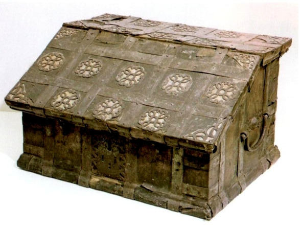 В собрании Кирилло-Белозерского музея-заповедника также находится ларь. Он состоит из четырех столпов треугольной формы, в каждый из которых вставлены стенки и дно. Стенки дополнительно укреплены в пазах несколькими деревянными шпонками. Ножкам снизу приданы фигурные очертания. отсутствующая крышка (вероятнее всего, плоская) прикреплялась двумя железными петлями на основе простой шарнирной конструкции. Сундук обит коваными железными полосами. На лицевой стенке – большая, состоящая из двух частей, кованая личина сложной формы. Ее форма и размеры свидетельствуют о весьма раннем происхождении. На сундуке, вероятно, был и навесной замок, вместо ручек на боковых сторонах – по два кольца. В одной паре колец сохранились пропущенные в них веревки. Не исключено, что кольца изготовлены значительно позднее и, таким образом, ручек на сундуке не было совсем. Не столько конструкция (имеющая, как указывалось выше, многовековую историю), сколько техника обработки железа и нынешнее состояние сундука указывают на длительность и сложность его истории62.