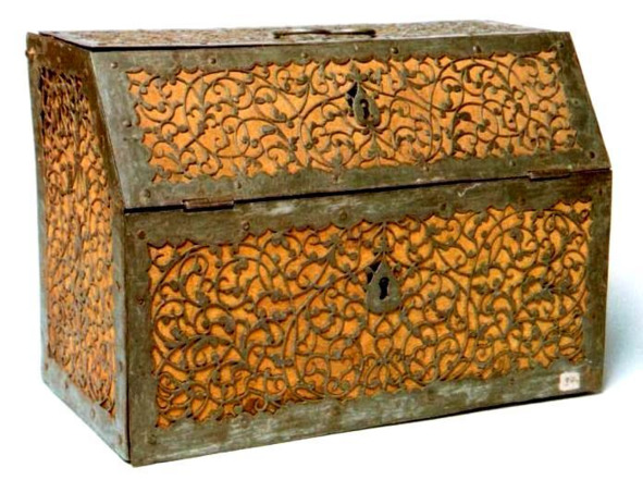 В коллекции отдела народного искусства Русского музея находится ларец, по пропорциям напоминающий комод (датируется XVIII веком, ил.6)89. Его лицевая и боковые стенки обиты прорезными пластинами железа с растительным орнаментом, состоящим из переплетающихся завитков (фон – бархат коричневого цвета). Дно и оборотная сторона укреплены сплошными пластинами железа. Внутри изделия – несколько полочек и ящичков, нижняя часть выдвигается.