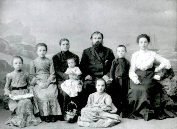 Семья Огибениных. Стоят: Иоиль, Макар, Тарас, сидят: Климентий Трофимович с женой, невестками и внучками (1881).