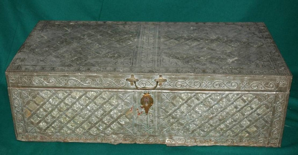 Сундук. Мастерская А. С. Алексеева, после 1887 – до 1902 года, Невьянск (Средний Урал). Дерево, жесть, латунь, литье, «мороз» по жести, гравировка, чеканка (ОНИ ГРМ).
