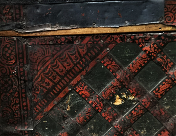 Сундук. Конец XIX – начало XX века, Тюмень. Дерево, железо, жесть, печать, окраска (деталь; частное собрание).