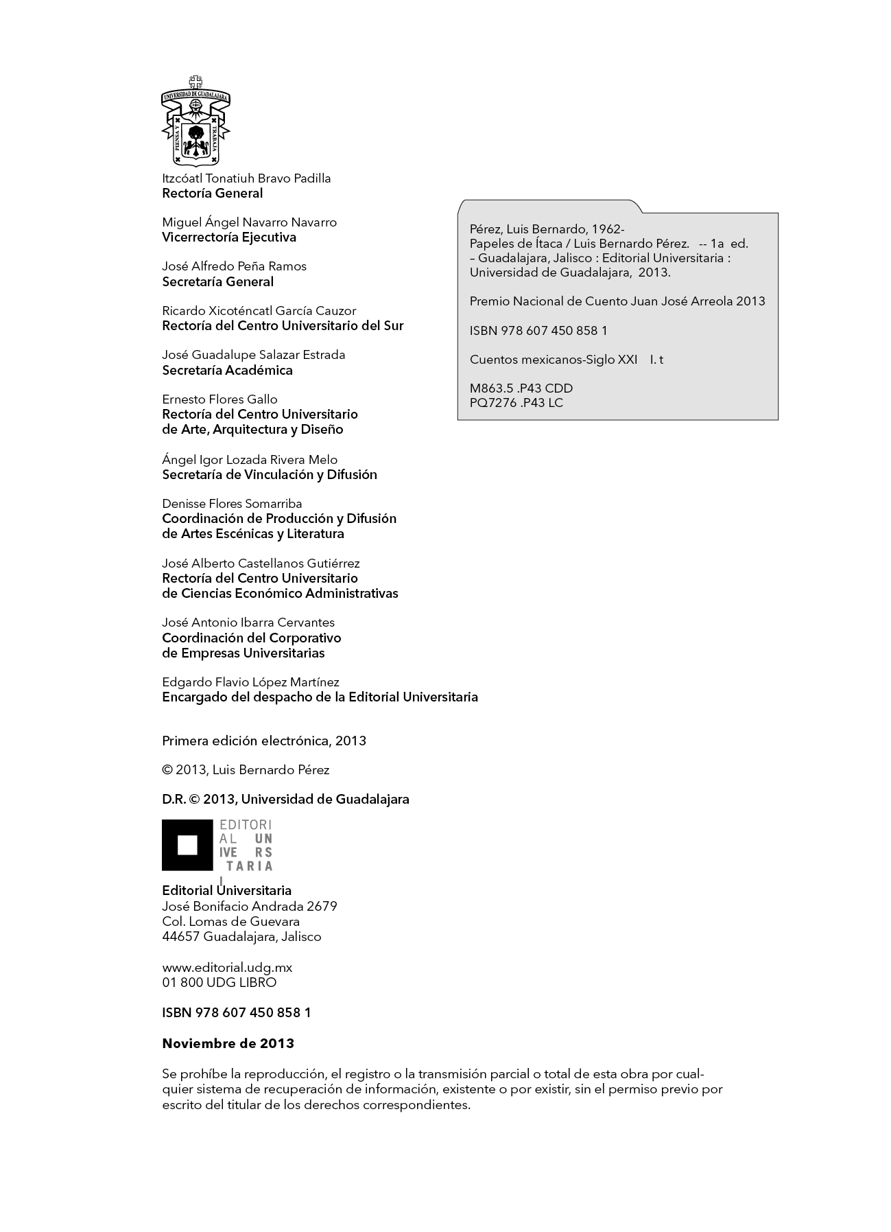 La obra ganadora de esta xii edición es Papeles de Ítaca de Luis Bernardo Pérez (Ciudad de México, 1962). El jurado estuvo integrado por Alberto Chimal, Bernarndo Fernández, y Andrés Acosta.