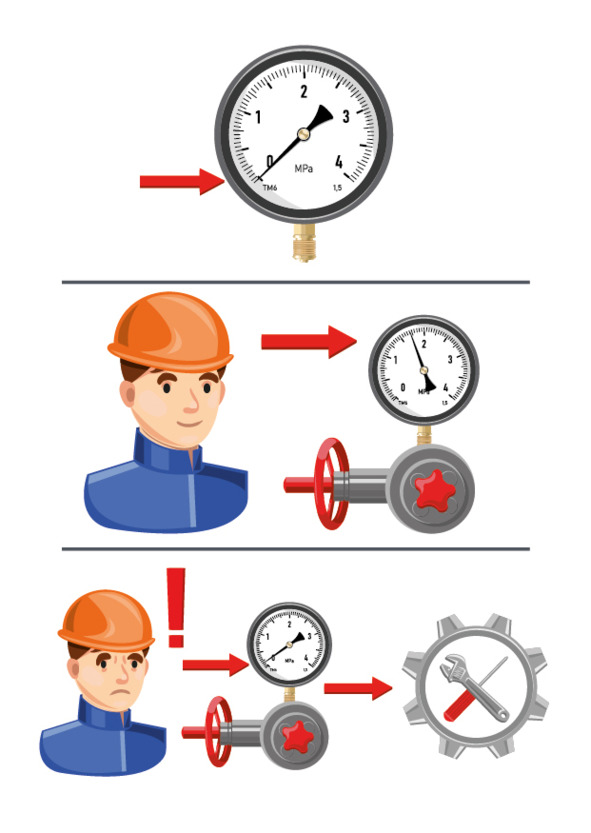Измерение давления: При измерении давления необходимо посмотреть что показывает стрелка манометра, когда давление снято. Стрелка должна быть на нуле.