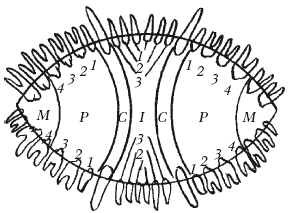 Расположение зубов у лабрадора-ретривера: I – резцы (Incisivi), С – клыки (Caninus), Р – ложнокоренные, или перемоляры (Praemolares), М – коренные, или моляры (Molares)