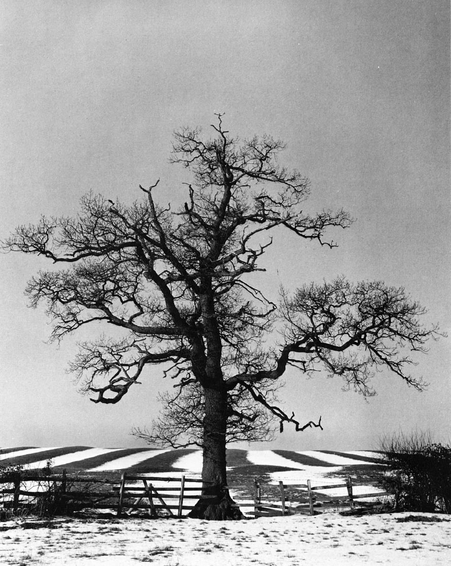 Snow picks out the ancient ridge and furrow, which is overlain by enclosure hedges. Warwickshire.