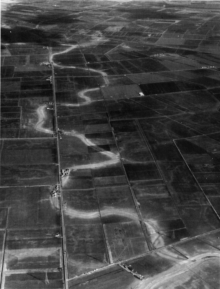 The ghost of a long-vanished river winds across the level geometry of the Fens. The silt bed of the old river now stands out against the adjacent black peat. © Cambridge University Collection of Air Photographs.