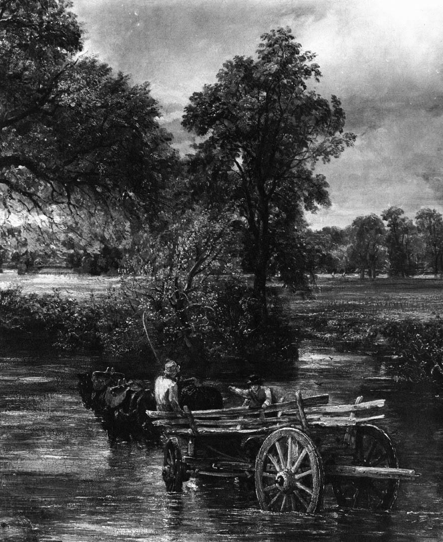 Take another look at The Hay Wain. Constable was a miller’s son, and probably knew all there was to know about mills such as Flatford. He was concerned here above all to paint a working landscape, not just a decorative one; and the empty wain is fording the stream to collect more hay from the labourers in the distant field. It was probably there for another reason too. George Sturt, who wrote about his practical experience of running a wheelwright’s shop at the end of the nineteenth century, describes the constant problem of shrinkage of timber wheelstocks in high summer: