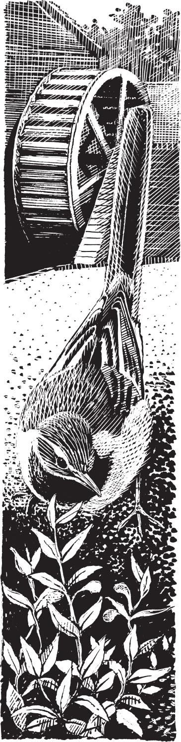 All this human interference with rivers, the building of millraces and millponds and, in some cases, quite major diversions of watercourses, did not destroy the essential character of rivers. On the contrary, it added to it, and not just in terms of the quality and character of the landscape, but also from the point of view of the wildlife. A tumbling weir creates the localized conditions of an upland brook wherever it crosses a silty lowland stream. Here grow the willow moss and liverworts found again in abundance only towards the sources of a brook. In the highly oxygenated water below a weir swim the little fish not known for nothing as the ‘miller’s thumb’: the flattened head of the fish was often compared with the thumb of the miller, worn it was said from testing the flour. Perhaps the loveliest of upland specialists associated with weirs and mill sites is the grey wagtail – grey in name, but not in appearance, with the flash of his canary-coloured chest. The grey wagtail nests in ledges and crevices of rock upstream, and finds a similar home in the crumbling walls and vertical structures of water mills. Edward Thomas may not have known that he was also making an ecological point when he pinned down so precisely the atmosphere and feel of these places: