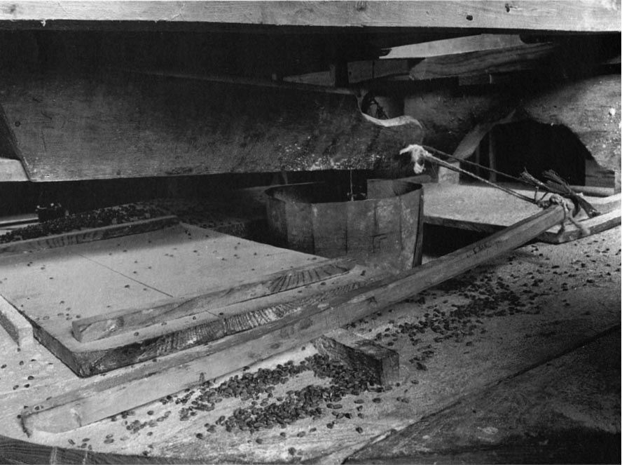 A pollard willow beside a water mill (top). ‘The miller’s willow’, a springy piece of timber, still gathered from the convenient pollard, for use as an essential part of the mill machinery. Charlecote, Warwickshire (bottom).