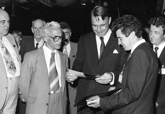 Президент Мауно Койвисто задержался на выставке дольше запланированного времени. С ним беседует космонавт Вячеслав Зудов, переводит Виктор Владимиров (в очках). За беседой наблюдают Андрей Капица (слева) и Антти Мялкёнен (справа)