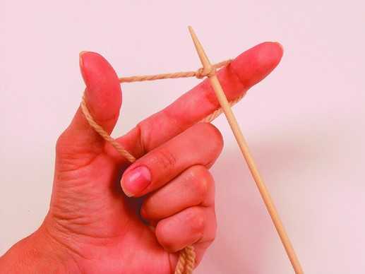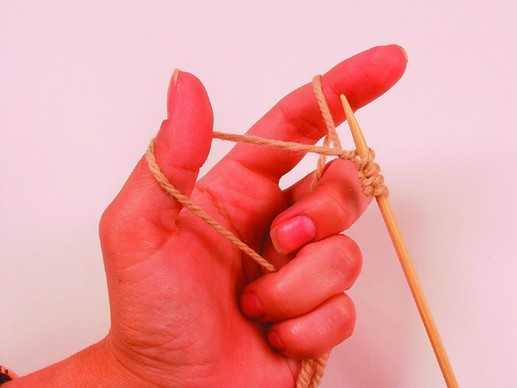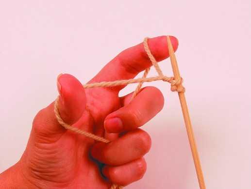 После этого спицей подхватите переднюю стенку петли у основания большого пальца, выньте палец и затяните петлю.