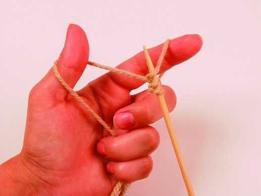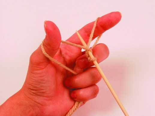 Затем нить, идущую от указательного пальца, проложите поверх спицы, а нитью, идущей от большого пальца, ее перекройте.