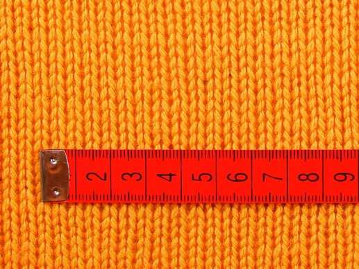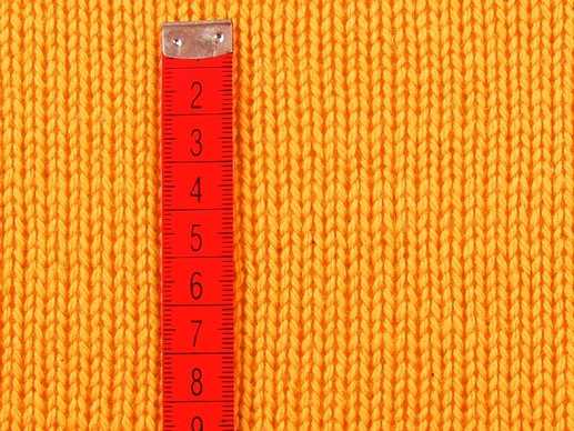 После того как вы подсчитали количество рядов, необходимо узнать количество петель в 10 см. На представленной фотографии в 10 см находится 20 петель. Получив количество петель на 1 см (2 петли), можно сделать соответствующие расчеты. Так, при вязании мужского джемпера сначала обмерьте объем бедер и разделите величину пополам. К примеру, объем составляет 110 см, разделив пополам, получаете 55 см. Это число умножьте на количество петель в 1 см (2 петли). В результате выходит, что для вязания джемпера 50–52-го размера на переднюю половину изделия необходимо набрать 110 петель. Если вязание будет проводиться круговыми спицами, то наберите нужно петли по объему, т. е. 220 петель. Если образец получился слишком рыхлым или слишком плотным, то попробуйте сменить спицы на более тонкие или толстые, в зависимости от желаемого результата.