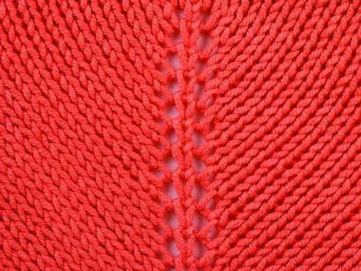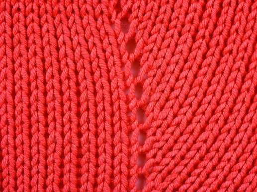 Довязав до места, где будет делаться прибавление петель, спицу введите в протяжку и, не провязывая, перекиньте ее на левую спицу. Затем следующую петлю провяжите лицевой и вновь введите спицу в протяжку и также перекиньте ее на левую спицу, не провязывая. В следующем ряду снятую в предыдущем ряду протяжку провяжите лицевой петлей, затем провяжите так же лицевой следующую петлю и следующую протяжку. В результате должна получиться центральная петля с ажурными дырочками.