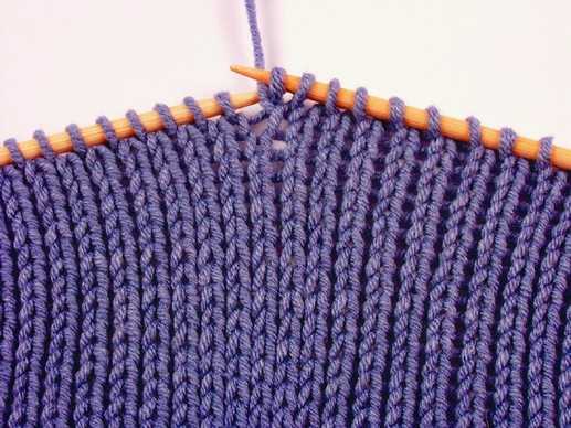 Прибавление можно делать как в начале вязания, так и посередине или же по всей ширине полотна. Для этого правую спицу введите в протяжку за заднюю стенку.