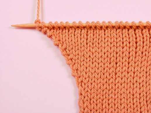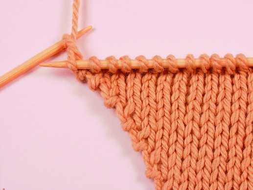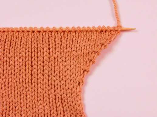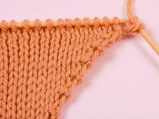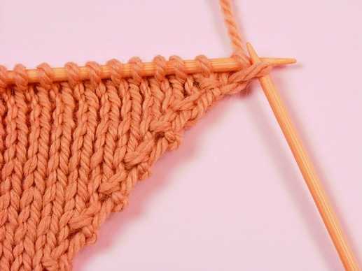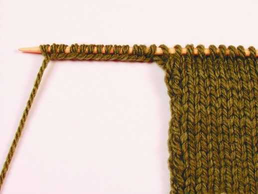 Прибавление петель из кромочных с правого края делают в конце ряда. Довязав до конца ряд, свободную спицу введите в кромочную петлю и перекиньте, не провязывая.