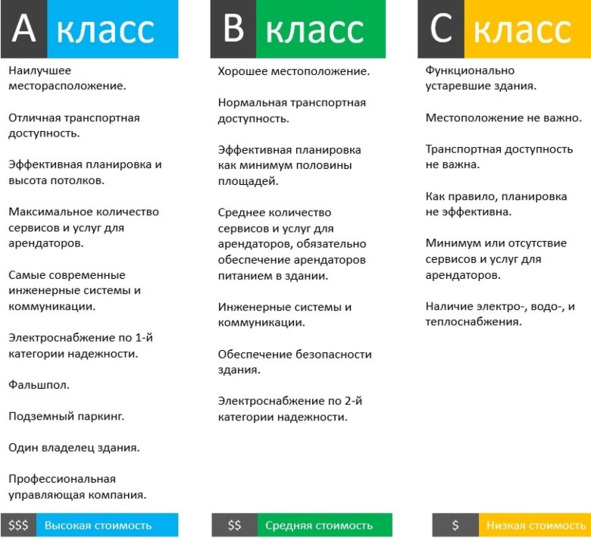Она разделяет офисную недвижимость на три класса: А, В и С в зависимости от набора характеристик.