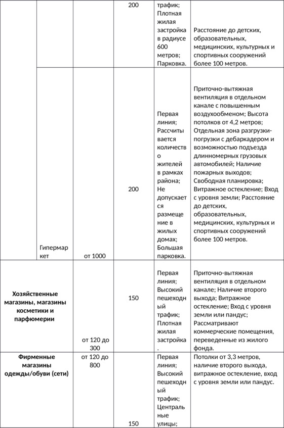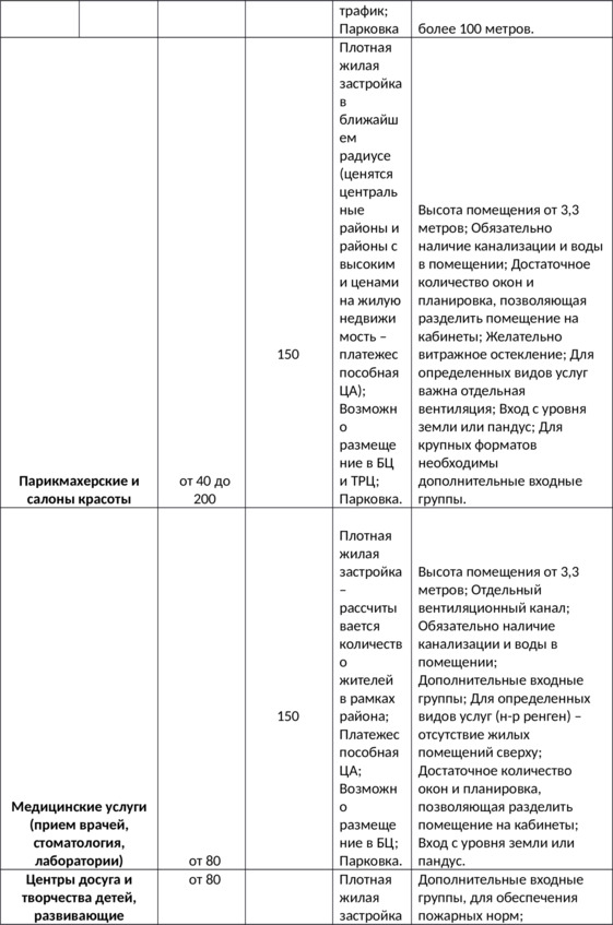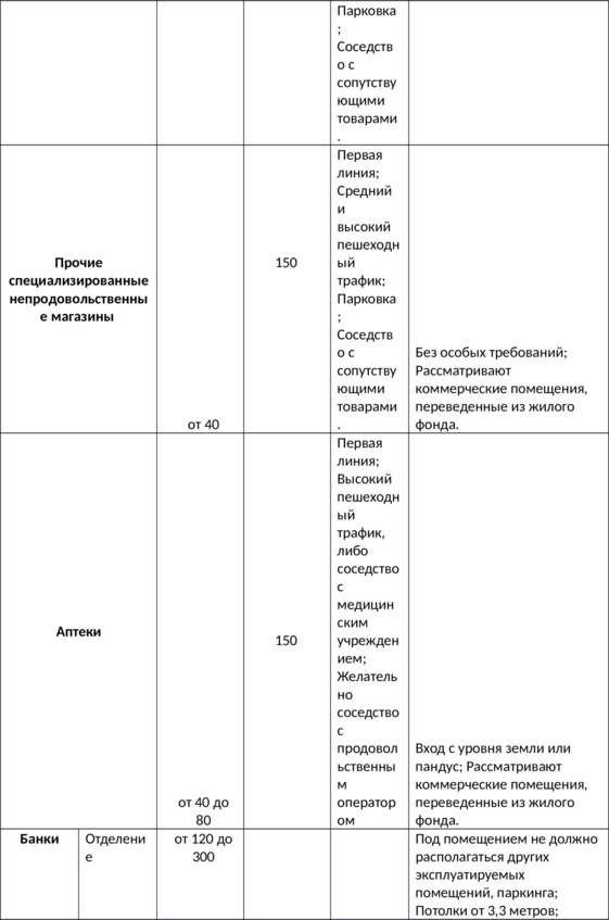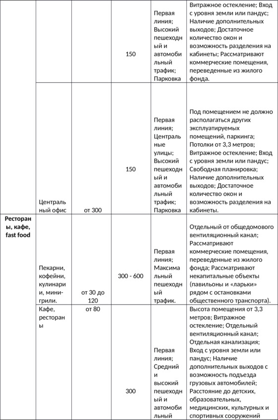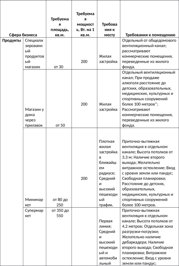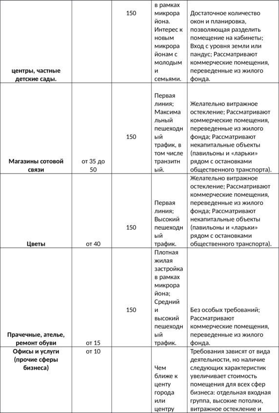 Ниже в таблице приведены требования к торговым и офисным помещениям у различных сфер бизнеса.