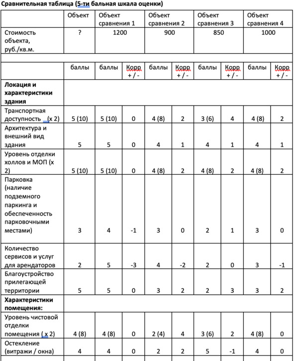 После получения сравнительных оценок, необходимо для каждого объекта сравнения сложить все значения по каждой характеристике и умножить на стоимость одного балла корректировки. Стоимость одного балла определяется делением средней цены объектов сравнения на количество критериев и разделенной на количество объектов сравнения.