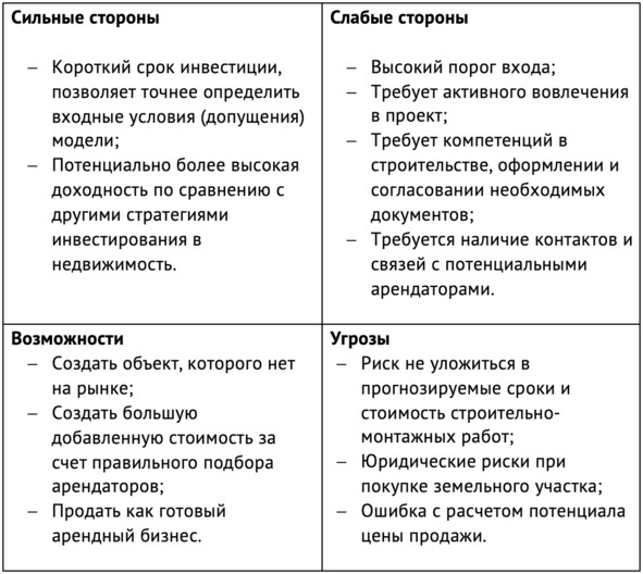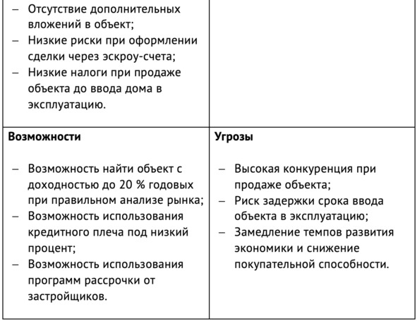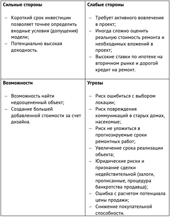 Таким образом, SWOT-анализ флиппинга подтверждает прямую взаимосвязь потенциально высокой доходности по этой стратегии инвестирования с большим количеством рисков и большим личным вовлечением в проект.