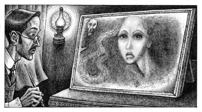 Сцена, как и действующие лица, была та же, но драматическое действие развилось. Высокий молодой человек держал женщину. Она вырывалась и с выражением отвращения, подняв голову, смотрела на него. Человека, стоявшего на коленях и ухватившегося за складки платья, оторвали от нее. Его окружало с дюжину людей – грубых, бородатых. Они устремились на него с ножами в руках. Казалось, все сразу ударили его. Их руки подымались и опадали. Кровь не текла из его тела – она била фонтаном. Его красное платье было промочено кровью. Он бросался во все стороны. Они продолжали наносить удары, и брызги крови взлетали из его тела. Это было ужасно, ужасно! Они потащили его по полу, продолжая наносить удары. Женщина взглянула на него через плечо, и рот ее открылся. Я ничего не слышал, но знал, что она закричала. Потом – от ужасной ли картины, подействовавшей на мои нервы, или от переутомления после непосильной работы последних недель, – но комната внезапно заплясала вокруг меня, пол словно исчез из-под моих ног, и я больше ничего не помню. Ранним утром хозяйка нашла меня без чувств перед серебряным зеркалом, но я ничего не помнил, пока не очнулся через три дня в мирном покое лечебницы.