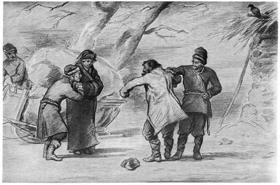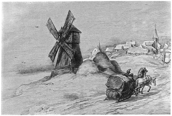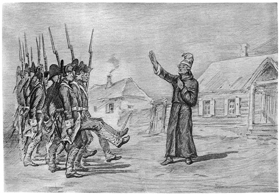 «Недоросль»Белогорская крепость находилась в сорока верстах от Оренбурга. Дорога шла по крутому берегу Яика[4]. Река еще не замерзала, и ее свинцовые волны грустно чернели в однообразных берегах, покрытых белым снегом. За ними простирались киргизские степи. Я погрузился в размышления, большею частию печальные. Гарнизонная жизнь мало имела для меня привлекательности. Я старался вообразить себе капитана Миронова, моего будущего начальника, и представлял его строгим, сердитым стариком, не знающим ничего, кроме своей службы, и готовым за всякую безделицу сажать меня под арест на хлеб и на воду. Между тем начало смеркаться. Мы ехали довольно скоро. «Далече ли до крепости?» – спросил я у своего ямщика. «Недалече, – отвечал он. – Вон уж видна». – Я глядел во все стороны, ожидая увидеть грозные бастионы, башни и вал; но ничего не видал, кроме деревушки, окруженной бревенчатым забором. С одной стороны стояли три или четыре скирда сена, полузанесенные снегом; с другой скривившаяся мельница, с лубочными крыльями, лениво опущенными. «Где же крепость?» – спросил я с удивлением. «Да вот она», – отвечал ямщик, указывая на деревушку, и с этим словом мы в нее въехали. У ворот увидел я старую чугунную пушку; улицы были тесны и кривы; избы низки и большею частию покрыты соломою. Я велел ехать к коменданту и через минуту кибитка остановилась перед деревянным домиком, выстроенным на высоком месте, близ деревянной же церкви.