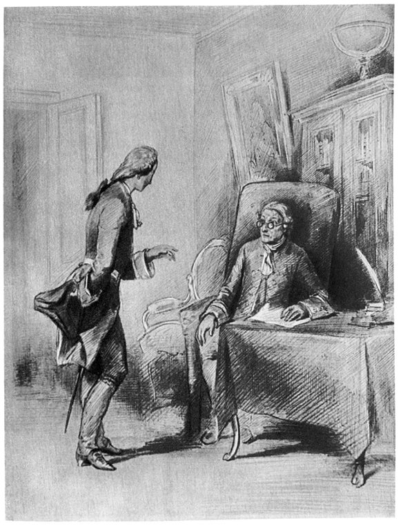 Подходя к комендантскому дому, мы увидели на площадке человек двадцать стареньких инвалидов с длинными косами и в треугольных шляпах. Они выстроены были во фрунт. Впереди стоял комендант, старик бодрый и высокого росту, в колпаке и в китайчатом халате. Увидя нас, он к нам подошел, сказал мне несколько ласковых слов и стал опять командовать. Мы остановились было смотреть на учение; но он просил нас идти к Василисе Егоровне, обещаясь быть вслед за нами. «А здесь, – прибавил он, – нечего вам смотреть».