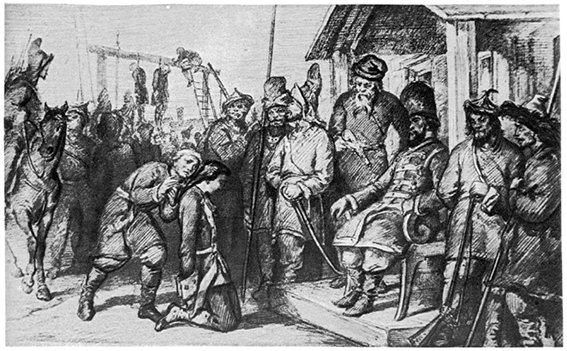 Жители начали присягать. Они подходили один за другим, целуя распятие и потом кланяясь самозванцу. Гарнизонные солдаты стояли тут же. Ротный портной, вооруженный тупыми своими ножницами, резал у них косы. Они, отряхиваясь, подходили к руке Пугачева, который объявлял им прощение и принимал в свою шайку. Все это продолжалось около трех часов. Наконец Пугачев встал с кресел и сошел с крыльца в сопровождении своих старшин. Ему подвели белого коня, украшенного богатой сбруей. Два казака взяли его под руки и посадили на седло. Он объявил отцу Герасиму, что будет обедать у него. В эту минуту раздался женский крик. Несколько разбойников вытащили на крыльцо Василису Егоровну, растрепанную и раздетую донага. Один из них успел уже нарядиться в ее душегрейку. Другие таскали перины, сундуки, чайную посуду, белье и всю рухлядь. «Батюшки мои! – кричала бедная старушка. – Отпустите душу на покаяние. Отцы родные, отведите меня к Ивану Кузмичу». Вдруг она взглянула на виселицу и узнала своего мужа. «Злодеи! – закричала она в исступлении. – Что это вы с ним сделали? Свет ты мой, Иван Кузмич, удалая солдатская головушка! не тронули тебя ни штыки прусские, ни пули турецкие; не в честном бою положил ты свой живот, а сгинул от беглого каторжника!» «Унять старую ведьму!» – сказал Пугачев. Тут молодой казак ударил ее саблею по голове, и она упала мертвая на ступени крыльца. Пугачев уехал; народ бросился за ним.