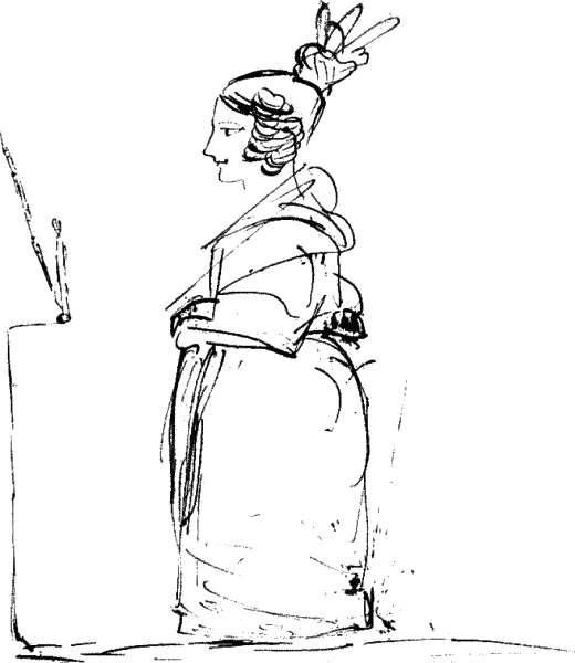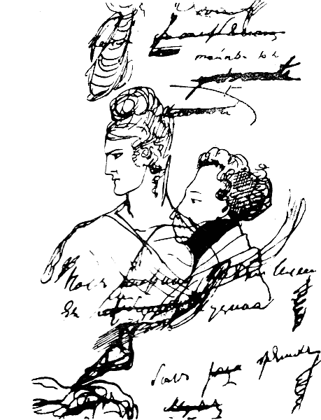 Автопортрет с Онегиным на набережной Невы: автоиллюстрация к гл. 1 романа «Евгений Онегин». Помета под рисунком: «1 хорош. 2 должен быть опершися на гранит. 3. лодка, 4. Крепость Петропавловская». В письме к Л. С. Пушкину. ПД, № 1261, л. 34. Нег. № 7612. 1824 г., начало ноября. Библиографические записки, 1858, т. 1, № 4 (рисунок воспроизведен на листе без пагинации, после столбца 128; публикация С. А. Соболевского); Либрович, 1890, с. 37 (воспр.), 35, 36, 38; Эфрос, 1945, с. 57 (воспр.), 98, 100; Томашевский, 1962, с. 324, примеч. 2; Цявловская, 1980, с. 352 (воспр.), 351, 355, 441.