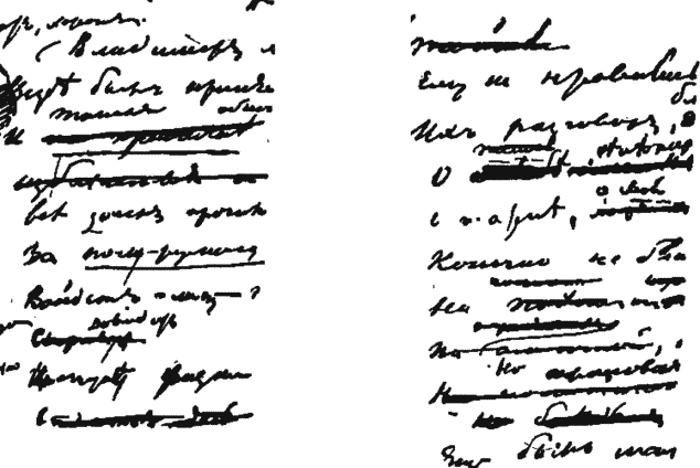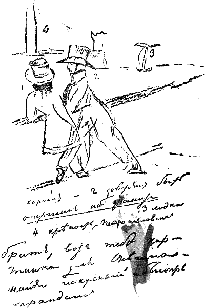 «…На листе № 28 тетради № 2365, среди грудящихся друг на друге рисунков – женских профилей, силуэтов и портрета Гёте – значатся несколько изобличающих слов: «Святой дух призывает Гавриила, открывает ему свою любовь и производит в сводники. Гавриил влюблен. (Это вычеркнуто.) Сатана и Мария»[14].