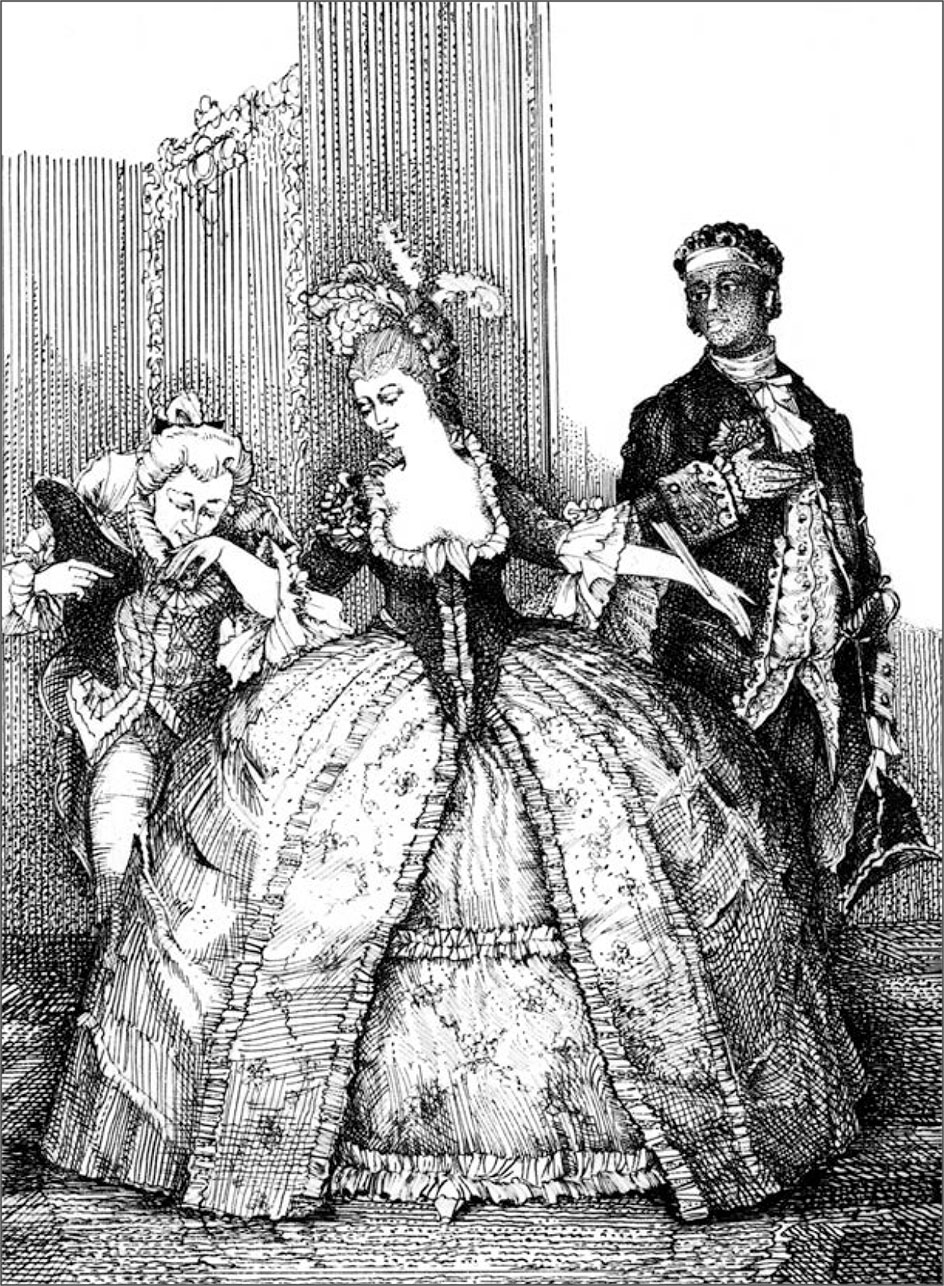 Несколько слуг бросились было в разные стороны, но в ту же минуту старая женщина, набеленная и нарумяненная, убранная цветами и мишурою, в штофном робронде, с открытой шеей и грудью, вошла припевая и подплясывая. Ее появление произвело общее удовольствие.