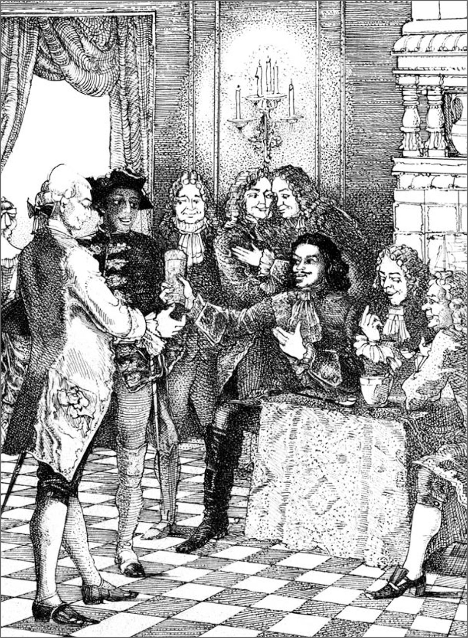В гостиной, в мундире при шпаге, с шляпою в руках, сидел царский арап, почтительно разговаривая с Гаврилою Афанасьевичем. Корсаков, растянувшись на пуховом диване, слушал их рассеянно и дразнил заслуженную борзую собаку; наскуча этим занятием, он подошел к зеркалу, обыкновенному прибежищ его праздности, и в нем увидел Татьяну Афанасьевну, которая из-за двери делала брату незамечаемые знаки.