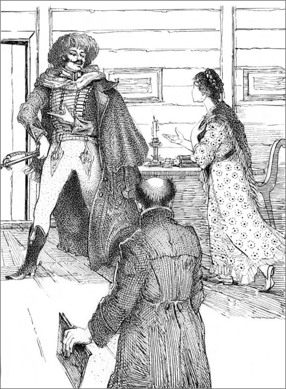 «Так вы знали мою Дуню? – начал он. – Кто же и не знал ее? Ах, Дуня, Дуня! Что за девка-то была! Бывало, кто ни проедет, всякий похвалит, никто не осудит. Барыни дарили ее, та платочком, та сережками. Господа проезжие нарочно останавливались, будто бы пообедать аль отужинать, а в самом деле только чтоб на нее подолее поглядеть. Бывало, барин, какой бы сердитый ни был, при ней утихает и милостиво со мною разговаривает. Поверите ль, сударь: курьеры, фельдъегеря с нею по получасу заговаривались. Ею дом держался: что прибрать, что приготовить, за всем успевала. А я-то, старый дурак, не нагляжусь, бывало, не нарадуюсь; уж я ли не любил моей Дуни, я ль не лелеял моего дитяти; уж ей ли не было житье? Да нет, от беды не отбожишься; что суждено, тому не миновать». Тут он стал подробно рассказывать мне свое горе. Три года тому назад, однажды, в зимний вечер, когда смотритель разлиневывал новую книгу, а дочь его за перегородкой шила себе платье, тройка подъехала, и проезжий, в черкесской шапке, в военной шинели, окутанный шалью, вошел в комнату, требуя лошадей. Лошади все были в разгоне. При сем известии путешественник возвысил было голос и нагайку; но Дуня, привыкшая к таковым сценам, выбежала из-за перегородки и ласково обратилась к проезжему с вопросом: не угодно ли будет ему чего-нибудь покушать? Появление Дуни произвело обыкновенное свое действие. Гнев проезжего прошел; он согласился ждать лошадей и заказал себе ужин. Сняв мокрую, косматую шапку, отпутав шаль и сдернув шинель, проезжий явился молодым, стройным гусаром с черными усиками. Он расположился у смотрителя, начал весело разговаривать с ним и с его дочерью. Подали ужинать. Между тем лошади пришли, и смотритель приказал, чтоб тотчас, не кормя, запрягали их в кибитку проезжего; но, возвратясь, нашел он молодого человека почти без памяти лежащего на лавке: ему сделалось дурно, голова разболелась, невозможно было ехать… Как быть? смотритель уступил ему свою кровать, и положено было, если больному не будет легче, на другой день утром послать в С*** за лекарем.