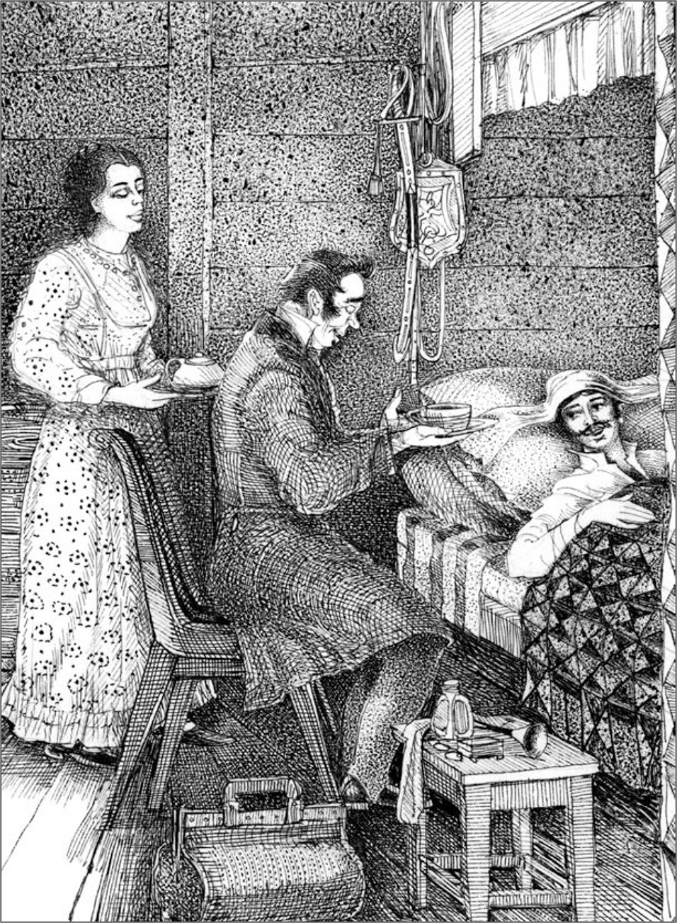 На другой день гусару стало хуже. Человек его поехал верхом в город за лекарем. Дуня обвязала ему голову платком, намоченным уксусом, и села с своим шитьем у его кровати. Больной при смотрителе охал и не говорил почти ни слова, однако ж выпил две чашки кофе и, охая, заказал себе обед. Дуня от него не отходила. Он поминутно просил пить, и Дуня подносила ему кружку ею заготовленного лимонада. Больной обмакивал губы и всякий раз, возвращая кружку, в знак благодарности слабою своей рукою пожимал Дунюшкину руку. К обеду приехал лекарь. Он пощупал пульс больного, поговорил с ним по-немецки и по-русски объявил, что ему нужно одно спокойствие и что дни через два ему можно будет отправиться в дорогу. Гусар вручил ему двадцать пять рублей за визит, пригласил его отобедать; лекарь согласился; оба ели с большим аппетитом, выпили бутылку вина и расстались очень довольны друг другом.