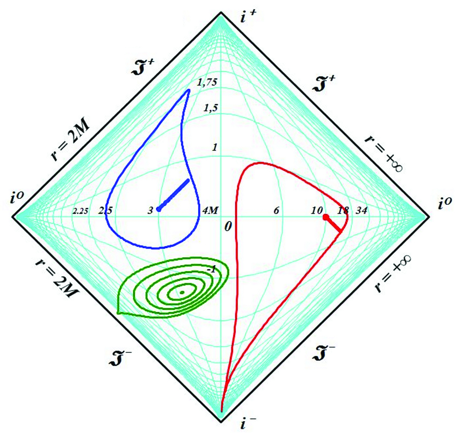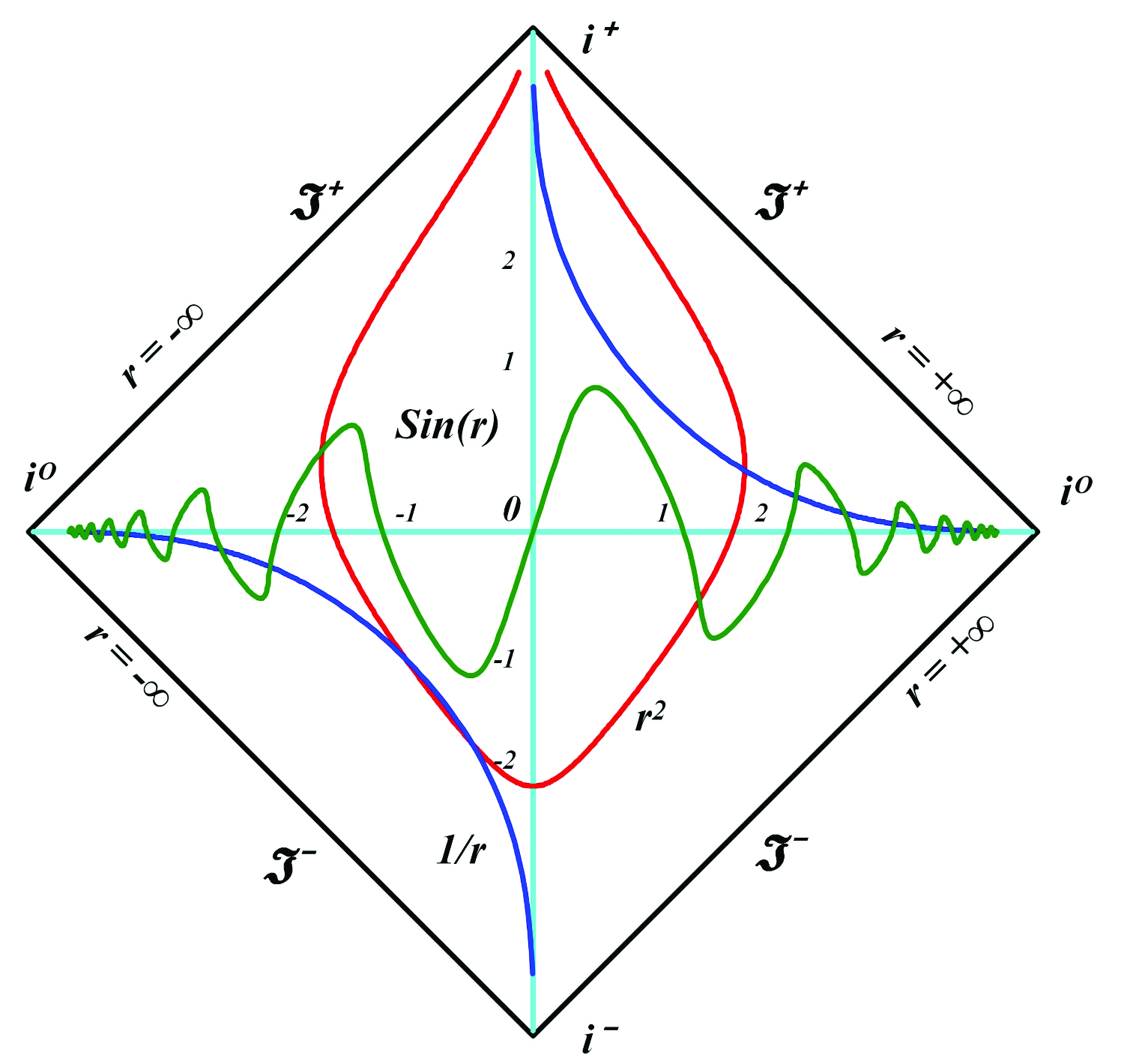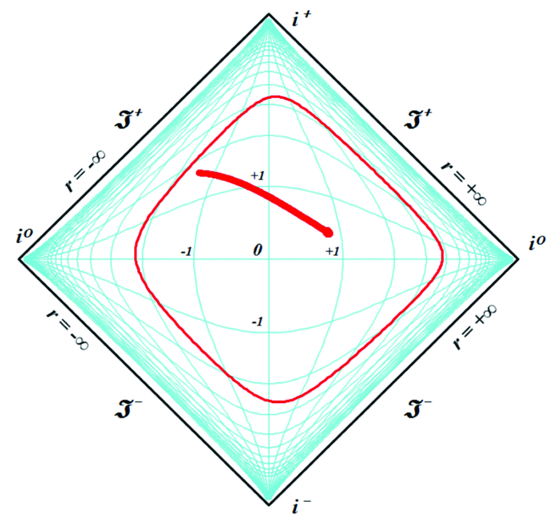 Используя уравнения преобразования координат, мы можем изобразить на диаграмме Пенроуза любую мировую линию, график вообще любой функции целиком. Для этого нам нужно знать только уравнение её движения r(t). Более того, мы можем нарисовать последовательность диаграмм для каждого момента времени по этим уравнениям, которые затем можно соединить в динамическую последовательность кадров, в анимацию.